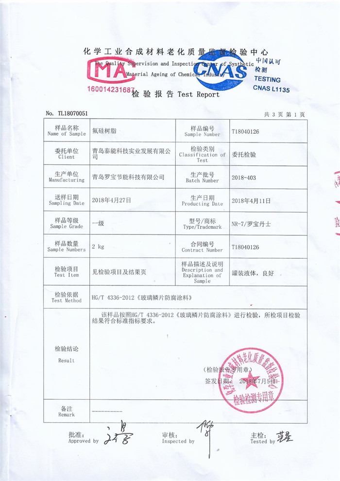 氟硅基玻璃鱗片防腐涂料(已申請國家發(fā)明專利) 該防腐涂料采用的基料是:具有國際先進技術(shù)的發(fā)明專利產(chǎn)品:羅寶·NR-7LP系列強滲透性氟硅防腐樹酯【IPN互穿網(wǎng)絡(luò)聚合物】作為基料(單組分),復(fù)合添加玻璃鱗片等納米材料復(fù)合而成。 采用獨特的噴涂、刷涂施工工藝,使復(fù)合材料在氧存在的條件下與空氣中的水分子發(fā)生反應(yīng),固化后可達到與陶瓷媲美的性能和效果。 優(yōu)勢是;單組分氟硅樹脂,施工過程中沒有可燃性溶劑的添加,耐高溫300℃具有防火性能、施工工藝技術(shù)簡單,可噴涂、滾涂施工,施工時間短(是傳統(tǒng)鱗片膠泥防腐施工時間的1/3)及超強的耐磨性、耐各種酸、堿、鹽的腐蝕,具有極高的硬度(邵氏93)和韌性不容易被損壞和開裂,(后續(xù)維護工藝簡單、費用?。┍砻鎳娡亢惺┑募{米氟硅復(fù)合樹脂,(如有特殊耐磨要求則噴涂添加碳纖維成分的氟硅防腐材料)使脫硫塔內(nèi)壁表面更加異常堅硬、強韌、光滑、耐磨使?jié){液不容易附著,所以使用壽命更長久,可在零下50℃環(huán)境溫度下施工的涂料。 為了區(qū)分其他系列玻璃鱗片防腐涂料,氟硅基玻璃鱗片采用天(酞)藍顏色加以區(qū)分